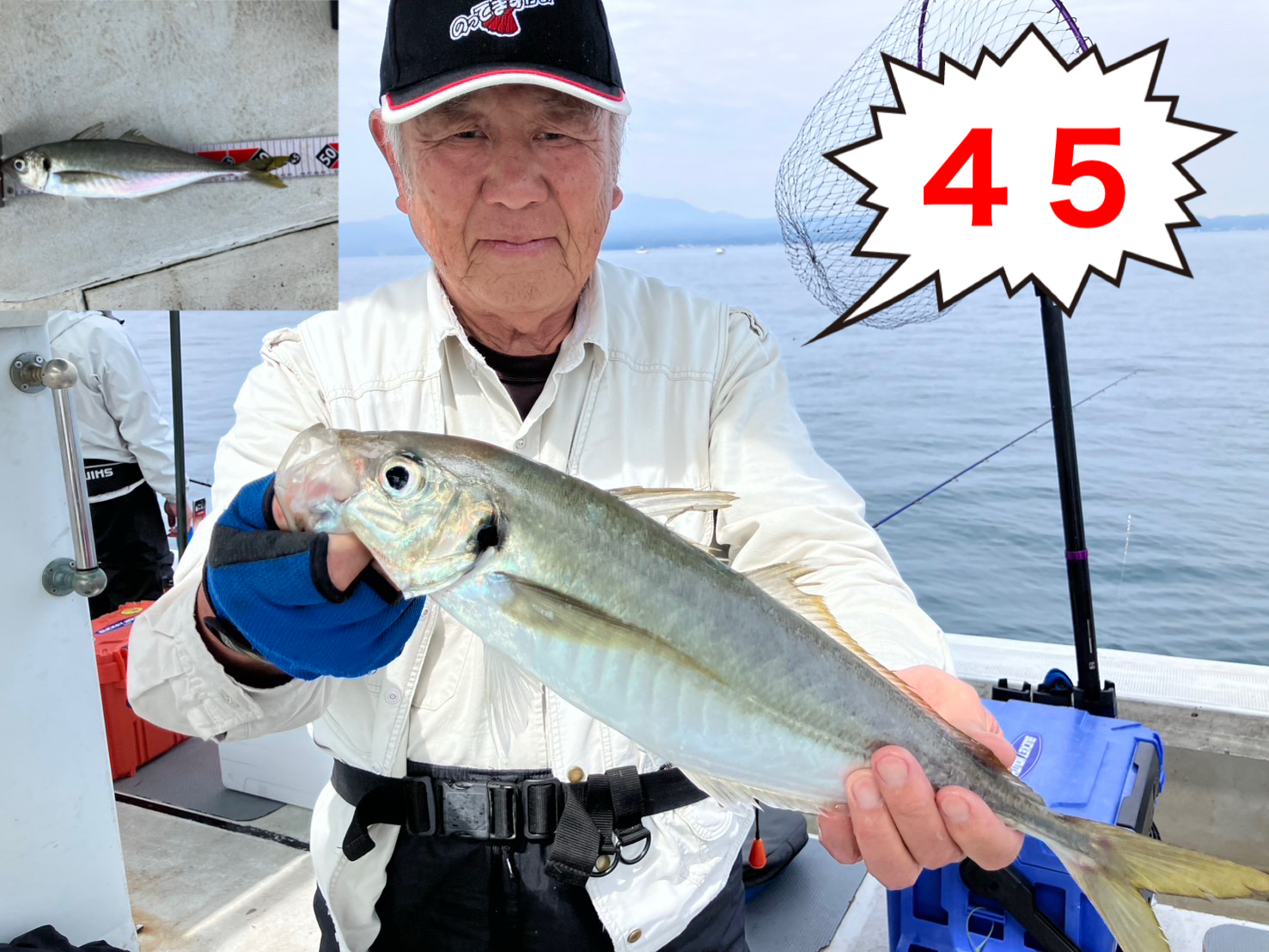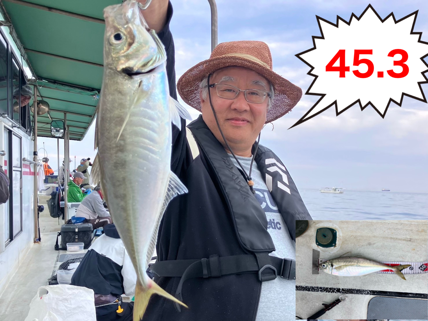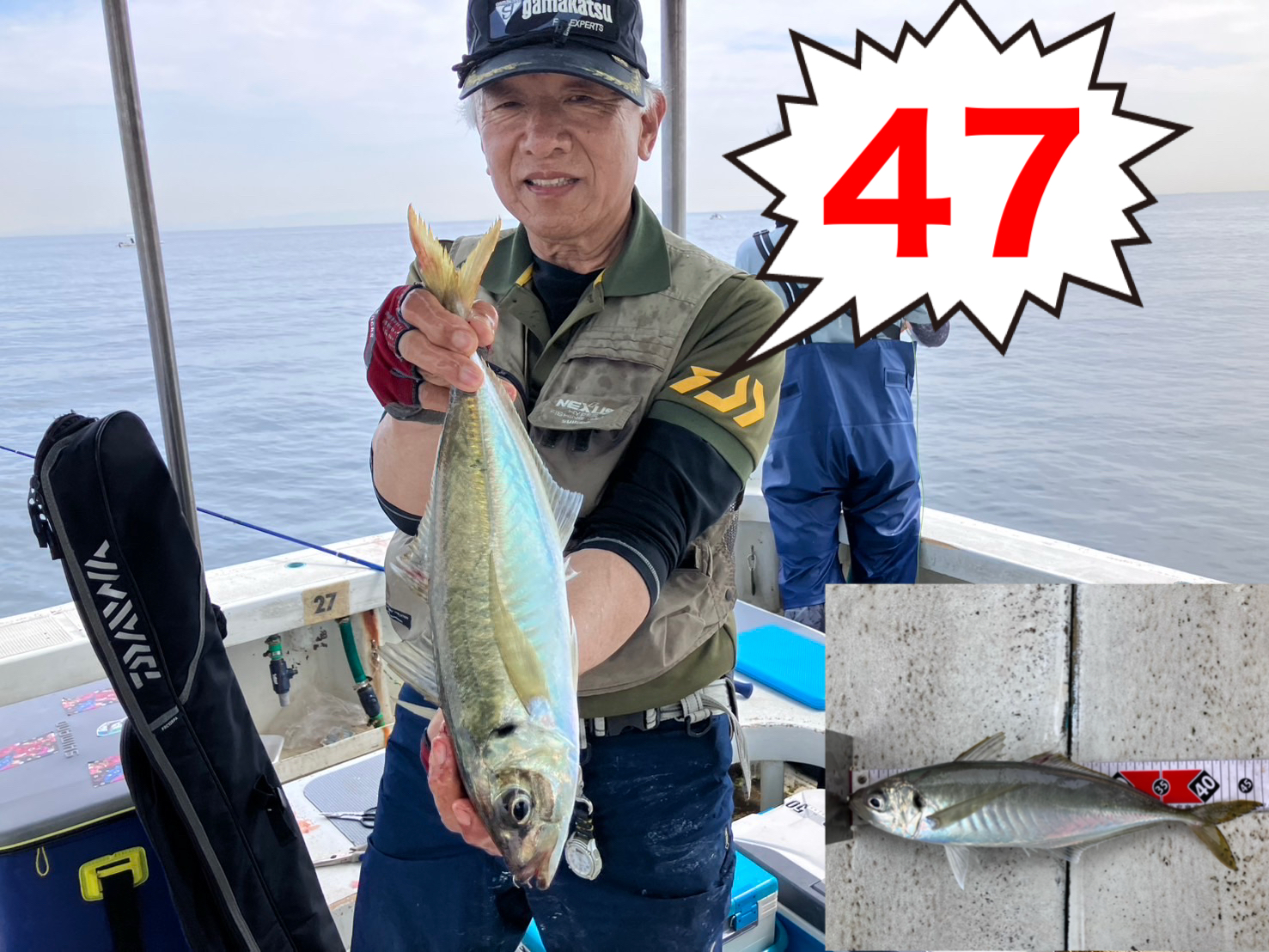鬼アジを釣った方は船長またはスタッフに検寸をお申し出下さい。45cm以上であれば『船長公認ステッカー』をお渡しいたします。帰港後、ステッカーを持って受付にお越し下さい。所定のフォームを記入して下さい。記念品を贈呈いたします。